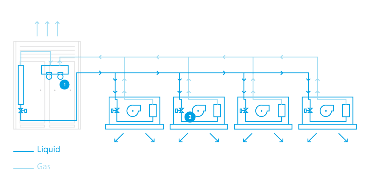 Kun yhteen ulkoyksikköön on yhdistetty enintään 64 sisäyksikköä, VRV-järjestelmä toimii Multi-Split-järjestelmän tavoin. Kukin yksittäinen sisäyksikkö määrittää tarvitsemansa tehon nykyisen sisälämpötilan ja halutun lämpötilan perusteella kaukosäätimen avulla (asetusarvo).
